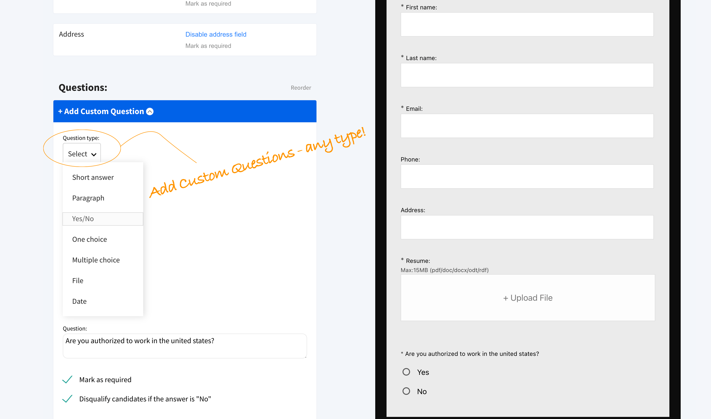 Select from different formats like short answers, multiple-choice, or yes/no questions for customized job forms