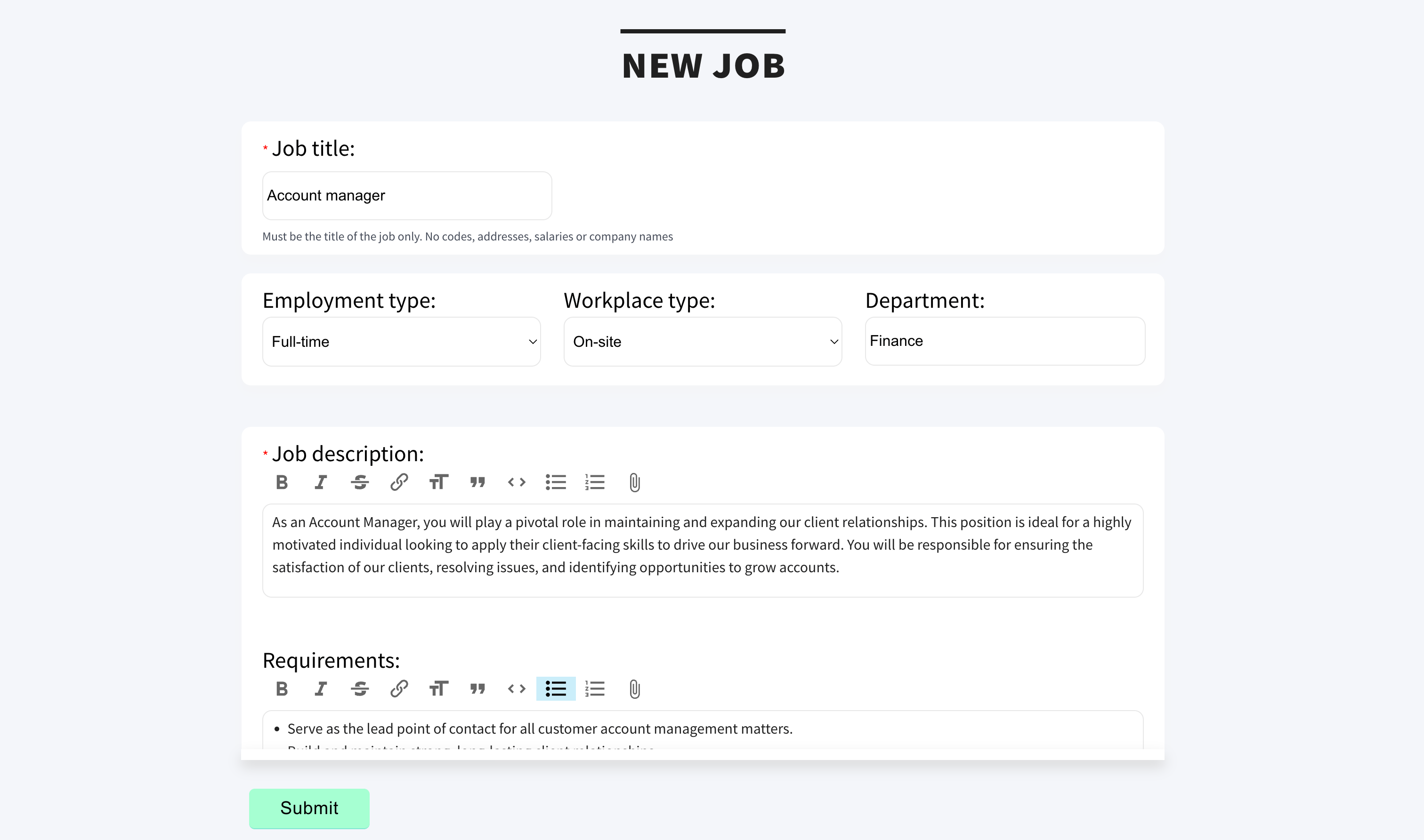 Easily make job postings that fit your needs. Add description, workplace salary, embed YouTube videos, and more.