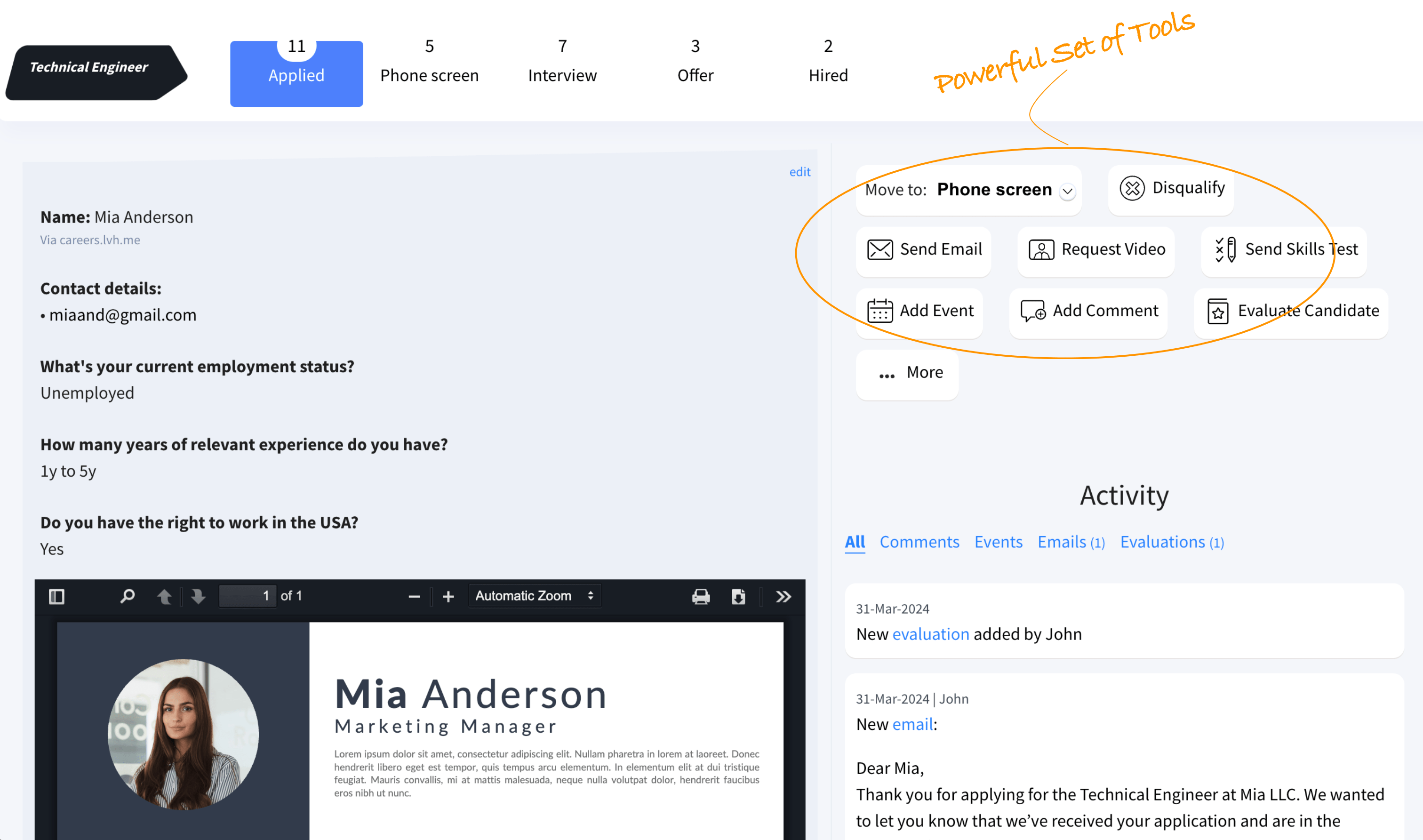 Simply review candidates with our powerful tools, including video interviews, email sending, and skills tests